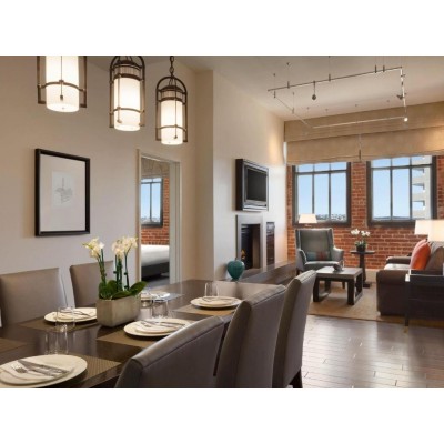 All spacious apartments at The Fairmont Heritage Place Ghirardelli Square include a fireplace and a high-end entertainment system. All bedrooms are designed with an enclosed glass shower in the en suite bathroom. Exposed brick walls in all apartments offer natural soundproofing and a preserved element of the original Ghirardelli Square façade. An in-unit washer and dryer are tucked away in a closet for guest use. Select apartments feature bay views.