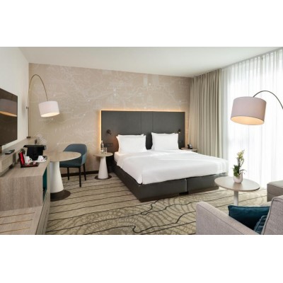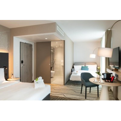 Just a 4-minute drive from Frankfurt International Airport, Hyatt Place Frankfurt Airport offers free WiFi, a 24/7 front desk, and a fitness center. It's less than a 12-minute train ride from Frankfurt city center. The spacious, modern rooms at Hyatt Place Frankfurt Airport feature Hyatt Grand Beds, a 42-inch HDTV, a refrigerator, a seating area, and tea/coffee making facilities. Other amenities include a multi-functional benchtop, an in-room safe, and a bathroom with a bath or shower. A delicious breakfast is served each morning, including hot dishes, cheeses, cold cuts, fresh juices, and pastries. Guests can also enjoy lunch and dinner at Zoom Glocal Dining, a casual urban restaurant. The hotel also offers a selection of fine takeaway options, such as fresh snacks, sandwiches, and salads. A 24-hour coffee and cocktail bar serves hot drinks, premium beers, wines, and cocktails. Hyatt Place also offers a total of 300 square meters of flexible meeting space. Other facilities include an electronics room with printers and computer desks. The hotel is 2 km from Frankfurt Airport and 7 km from both the Frankfurt Messe Fairgrounds and Frankfurt city center. The adjacent Gateway Gardens train station provides connections to Frankfurt Airport, Frankfurt Central Station, Deutsche Bank Park, and the Taunusanlage and Hauptwache train stations in the city center.